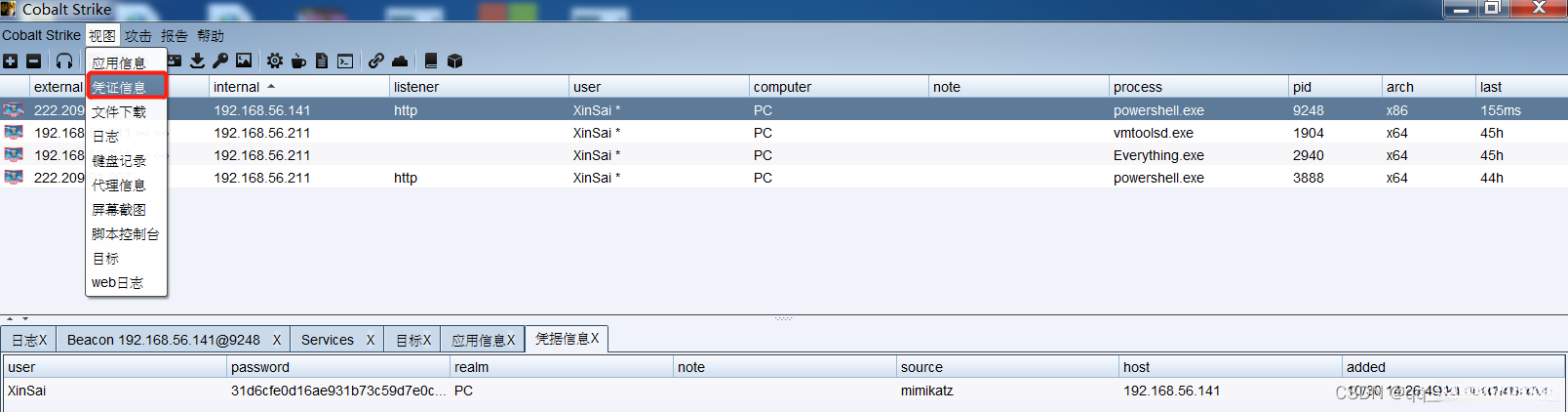 在View --> Credentials下可以查看到hashdump与mimikatz获取的数据。