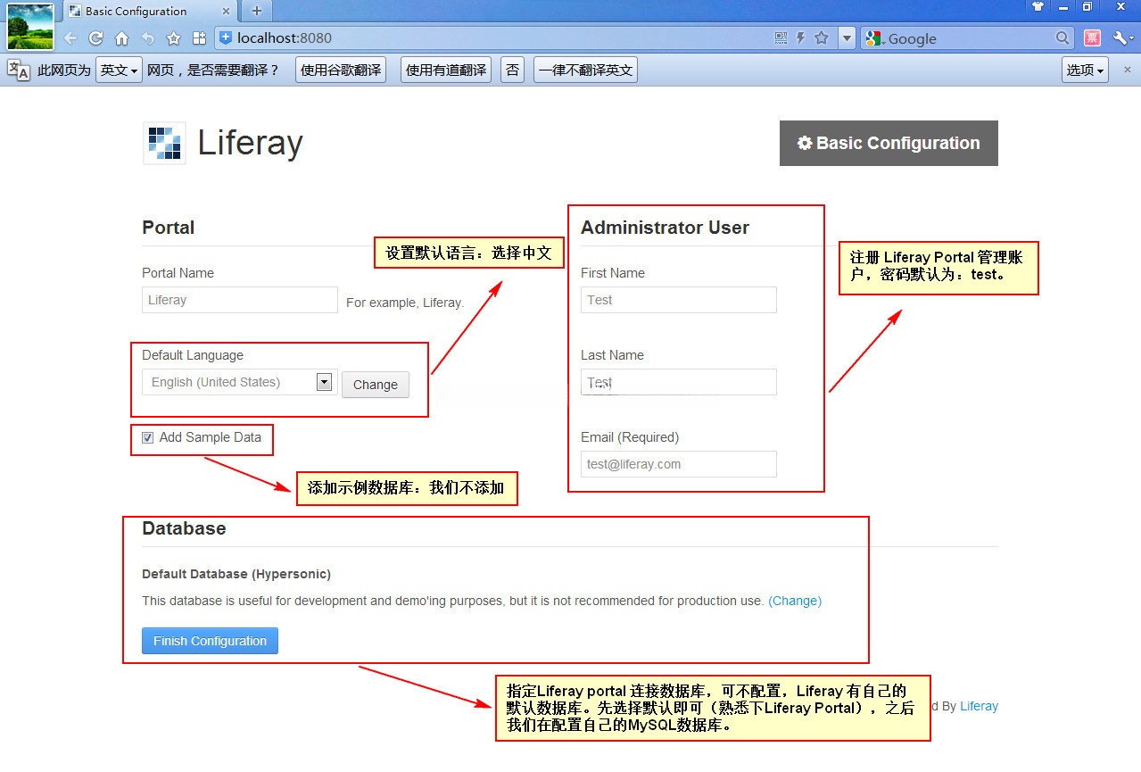 启动成功,输入 localhost:8080进入Liferay Portal。如下图设置: