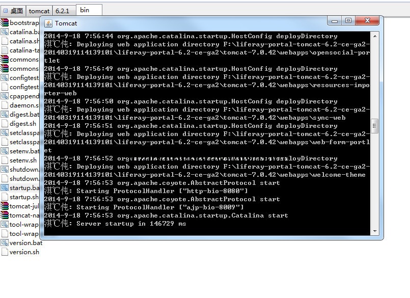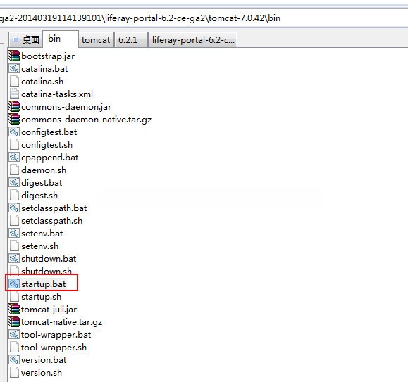 运行一个名为Tomcat的Liferay服务程序位于指定路径...\lfonye-portal-6.2-ce-ga2\tomcat-7.0.42\bin下执行 startup.bat脚本,请参考下图: