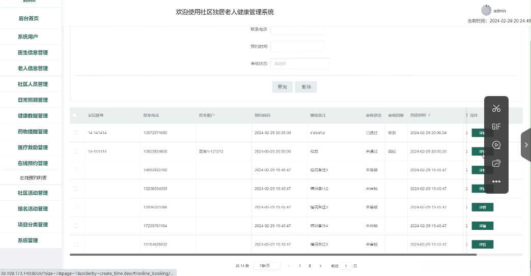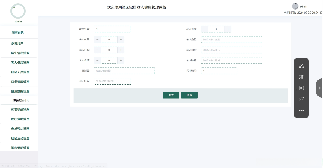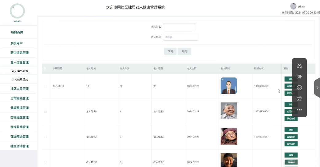 通过登录进入社区独居老人健康管理系统后, 用户能够进入到管理员界面查看相关信息: 主页面为系统概述界面; 个人中心展示用户的个人信息; 系统用户模块包含基础资料设置; 老人信息模块提供针对老年人的数据记录功能; 健康数据模块用于保存和分析患者的医疗数据; 医生信息模块集中医生的详细资料; 社区人员模板展示社区工作人员的信息; 日常照顾模板记录用户的日常护理情况; 药物提醒模板帮助制定用药计划; 医疗救助模板提供紧急医疗资源对接服务; 在线预约模板支持线上预约挂号功能; 社区活动模板列出社区组织的各项活动内容; 报名活动模板供用户参与活动报名; 项目分类模板归类不同类型的健康管理项目.