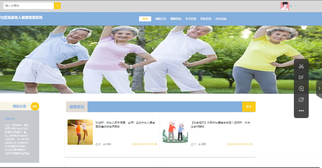该系统具备全面功能配置, 包括首页管理模块, 用户个人空间, 信息发布平台, 健康知识库, 医疗专家介绍, 社区服务内容以及详细活动安排等部分。此外, 系统还具备后台提供系统维护与功能更新支持的能力