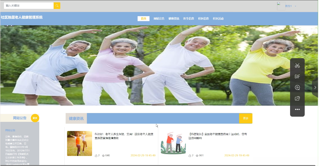 登录系统后, 医生能够访问首页以及个人中心, 并查看网站公告. 此外, 还能浏览健康资讯. 同时, 可以查阅医生信息和社区信息等资源内容; 详细内容请参考图5-10所示的位置.