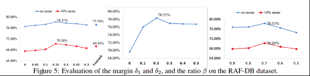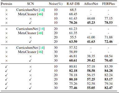 SCN在噪声数据集上的表现要优于其它模型,在RAF-DB上的表现最佳。作者也对这一现象给出了原因,因为RAF-DB的label是由非专业人士标注,相对其它数据集来说,错误的标签更多。