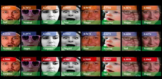 第一行使用的是RAF-DB中的原始图片进行训练,第二行给原始图片的label加入噪声(修改label),然后用不带relabel的网络训练,我们会发现表情的权重相对原始图片的权重都有所下降,表明模型很好的对错误label的表情权重进行了抑制,第三行是带relabel的网络训练噪声label,可以发现模型对于happy表情的错误label能进行很好的纠正,其它表情也能取得较为接近的纠正效果。