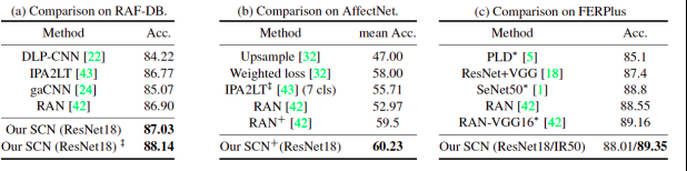 - SCN在RAF、AffectNet、FERPlus上的性能表现