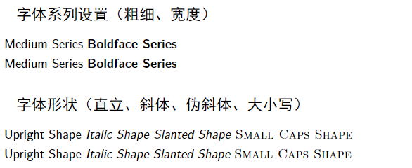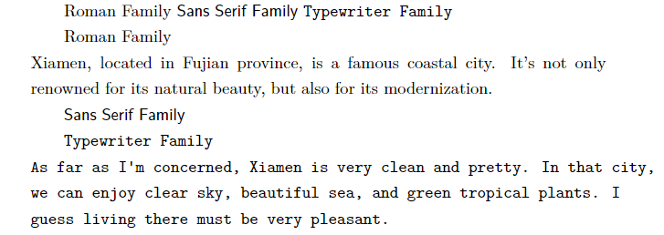 \sffamily Sans Serif Family %该命令下面的字体都是是无衬线字体字体,直到新的声明出现覆盖该声明。