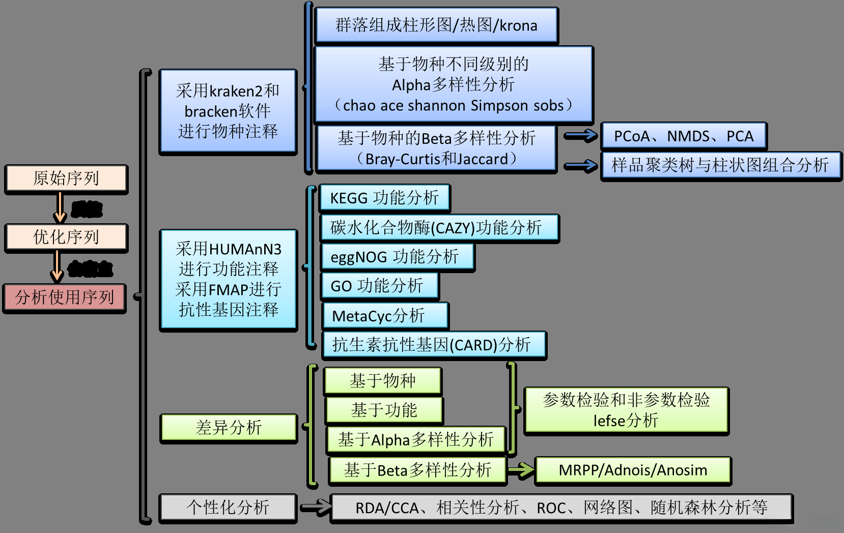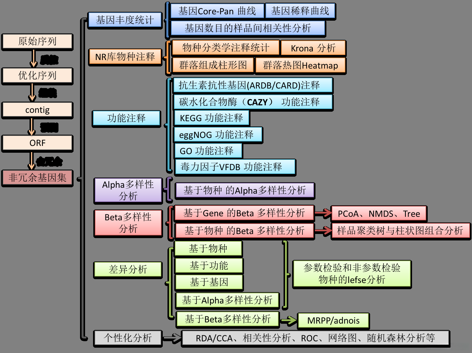 数据分析从下机原始序列开始,首先对原始序列进行去接头、 质量剪切以及去除污染等优化处理。然后使用优质序列进行拼接组装和基因预测,将各样本预测得到的基因集合并在一起去冗余,得到非冗余基因集;对得到的非冗余基因集与NCBI的nr数据库进行比对,得到物种信息,与各个功能数据库(抗性基因ARDB/CARD、碳水化合物CAZy数据库、KEGG数据库,eggnog数据库、VFDB数据库)进行比对,得到不同功能的注释结果。并使用BWA软件将优化序列比对到非冗余基因集,计算得到各基因在各样品中的丰度信息(RPKM); 最后对物种和功能注释结果进行统计及后继分析。