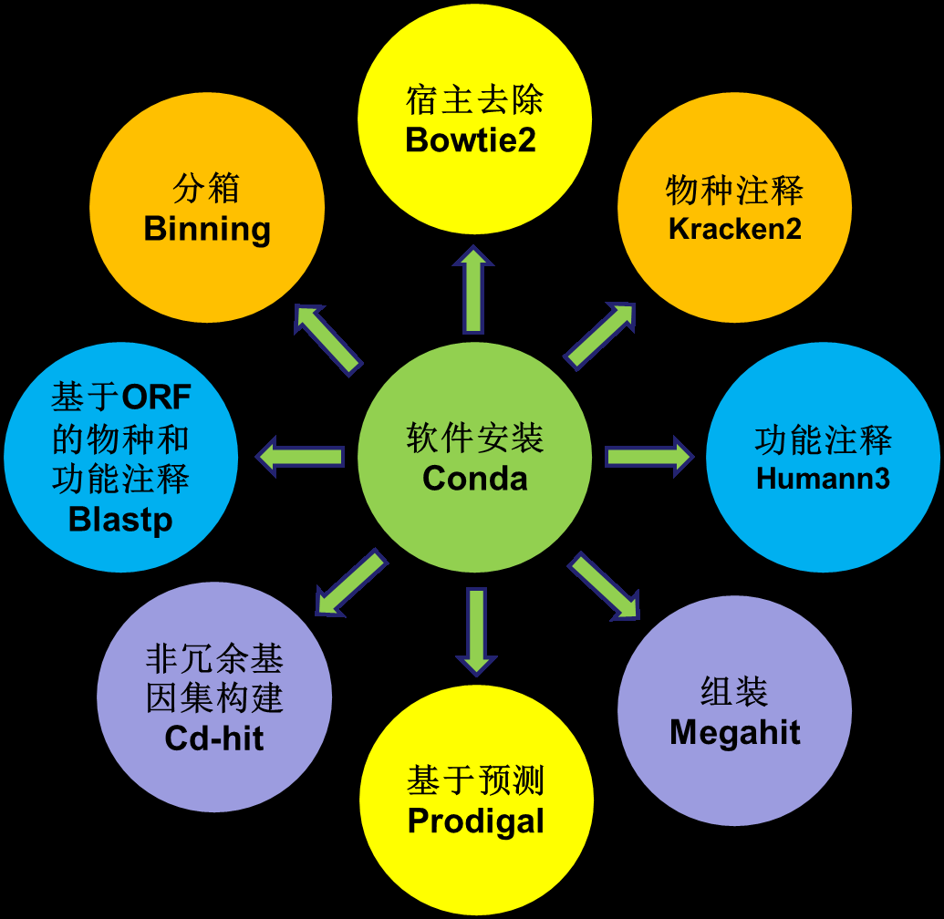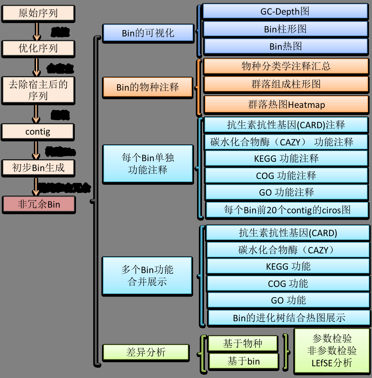 宏基因组分箱(Binning)是将序列组装得到的Contigs按物种分开归类的过程。基于Binning的宏基因组分析流程,数据分析从下机原始序列开始,首先对原始序列进行去接头、 质量剪切以及去除污染等优化处理。然后使用优质序列进行拼接组装得到Contigs;使用metabat2和maxbin2软件分别对每个样本的Contigs进行分箱;不同软件分箱得到的bin进行合并(binning_refiner)、提纯(MAGpurify);然后将所有样优化后的bin进行去冗余(dRep);而后分别从物种和功能方面进行信息统计。