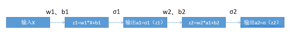 其中,X、b是1维列向量,w是2维矩阵,对应的输出a1、a2也是1维列向量,a2也是模型输出,σ是激活函数,为了计算我们假设σ为sigmoid(细节见往期)