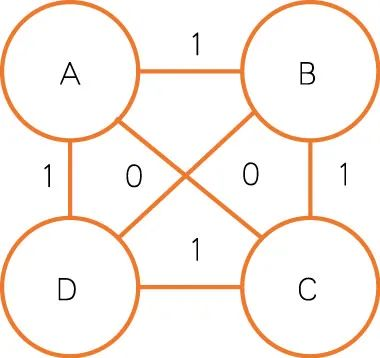 以QAOA适用的最大分割问题经典场景为例: 假设有A、B、C、D四个主体需进行分割,其相互之间存在的关联性紧密度用权重表示,如图1所示。