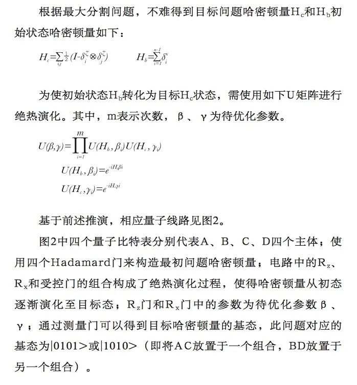 在量子近似优化算法方面。 2014年,量子近似优化算法(Quantum Approximate Optimization Algorithm,QAOA)由Edward Farhi等人提出。QAOA算法是一种经典计算与量子计算的混合算法,可用于解决组合优化问题、最大分割问题等难题。该算法在解决某些NP-hard问题时有明显的加速效果,可以在多项式复杂度下给出问题的近似解。QAOA算法的核心思想是通过量子绝热优化算法从初始哈密顿量的基态,逐步迭代演化至目标问题的哈密顿量的基态;在此过程中需要逐步优化量子绝热算法的参数,参数的优化过程主要是在经典计算上完成,绝热演化过程是在量子计算上完成。原则上,QAOA算法需要在通用量子计算机上完成运算,即要求量子计算机能实现图灵完备的量子门操作;然而,受限于通用量子计算机的物理实现,目前停留在几十个量子比特的规模,近年来有一些其他架构的量子计算方案,例如相干依辛机(Coherent Ising Machine),专门针对组合优化问题有更强的加速效果,同时实验上规模能提升到上万量子比特。