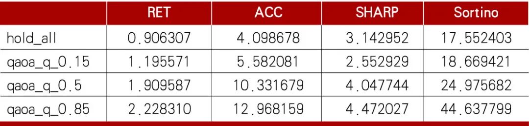 从组合指标来看,在不同的投资者风险偏好场景下,针对收益率(Return,RET)、累计收益(Accumulated Return, ACC)、夏普比率(Sharp Ratio)和索提诺比率(Sortino Ratio)四个维度,将量子QAOA算法与对照组进行对比。结果显示,除风险厌恶环境下量子QAOA算法组合的夏普比率略低于对照组外,量子QAOA算法所构造的组合在其余各指标表现均优于对照组。