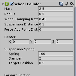 unity是一个专业的3d游戏引擎,有完整的物理系统。那么对于无人驾驶自行车,我们首先需要一辆基于物理运动的车。unity有一个内置的用于赛车游戏的车轮组件:Wheel Collider,它的参数除了图中截到的车轮重量,车轮半径,悬架弹力设置等等,还有前向,侧向摩擦等设置,该组件达到的效果就是能较为真实的模拟各种车轮。对于自行车,对各个参数设置一个较为合理的数值,比如车轮半径0.5m。