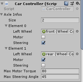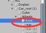 而这只是一个轮子的,自行车有两个轮子,那就需要两个Wheel Collider,在unity项目中,也就是front(前轮)和rear(后轮)