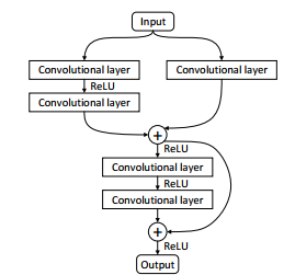 该网络采用两个连续的卷积层分别作为输入与输出,并在中间部分包含多个独立的卷积模块构成架构主体。其中每个卷积模块均具有64个特征通道,在设计上借鉴了残差网络与inception模型的基本思路:即在进入深度学习计算前将信息分道扬镳并分别进行处理,在完成基本运算后再进行整合优化以提升整体性能