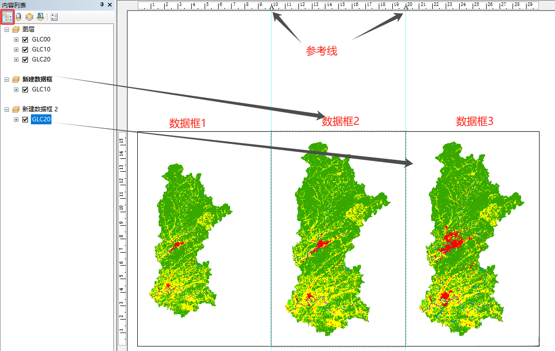- 设施各个数据框的比例尺,确保图层显示良好效果;同时,如果地图未居中,则在数据视图中进行轻微调整。