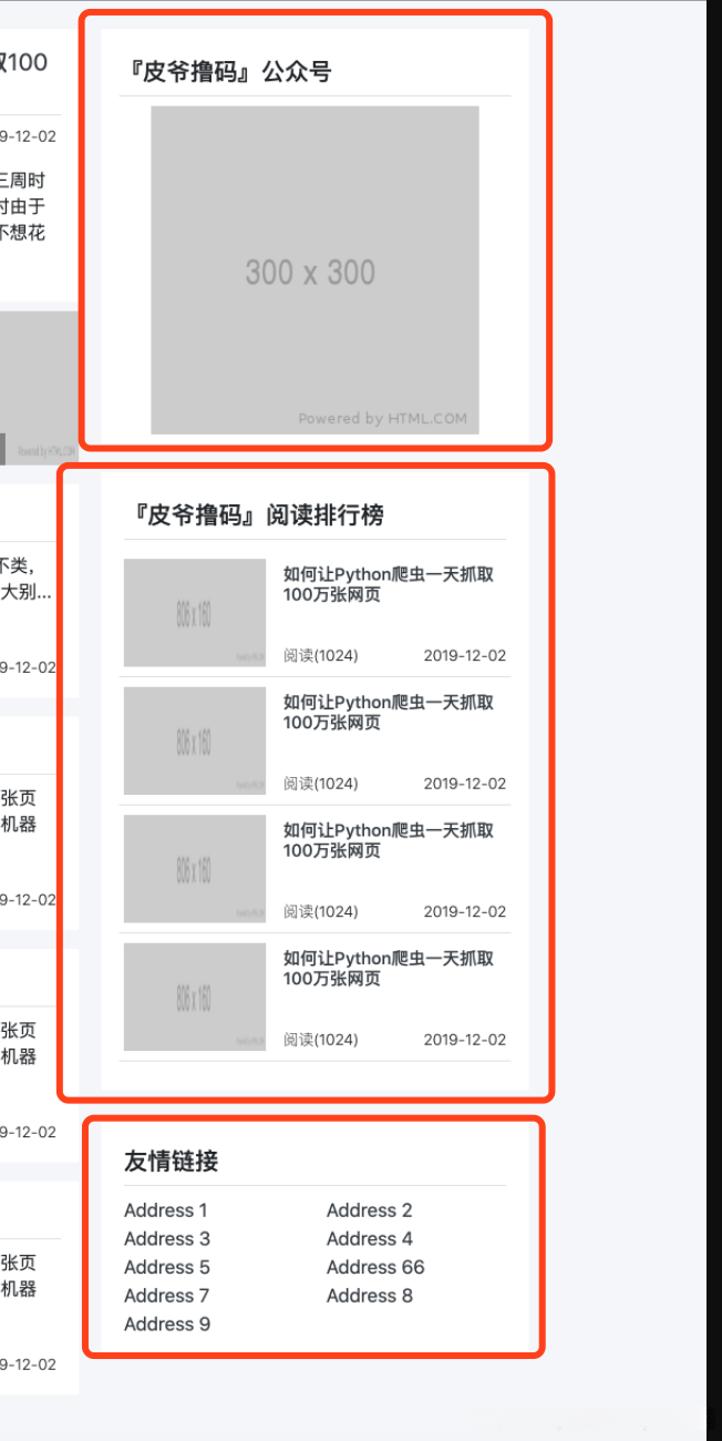 目前就是三个板块,公众号二维码,阅读排行以及友链板块,原理还是用的Bootstrap的row那一套,每一个板块分为两个row:标题一个row,内容一个row。实现起来很简单,具体可以简单看一下代码结构: