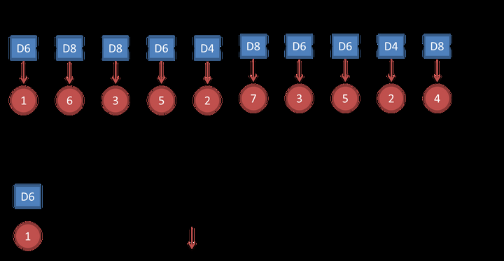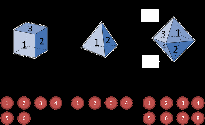 一个经典的案例就是投掷不同的多面形。假设我在手上拥有三个不同类型的骰子。其中第一个是我们日常使用的六面体(命名为D6),每个数字从1到6出现的概率均为1/6。第二个是一个四面形(命名为D4),四个面上的数字1到4各出现的概率都是相等的。第三个则是一个八面色体(命名为D8),其上标记的数字从1到8各出现的概率也相同。