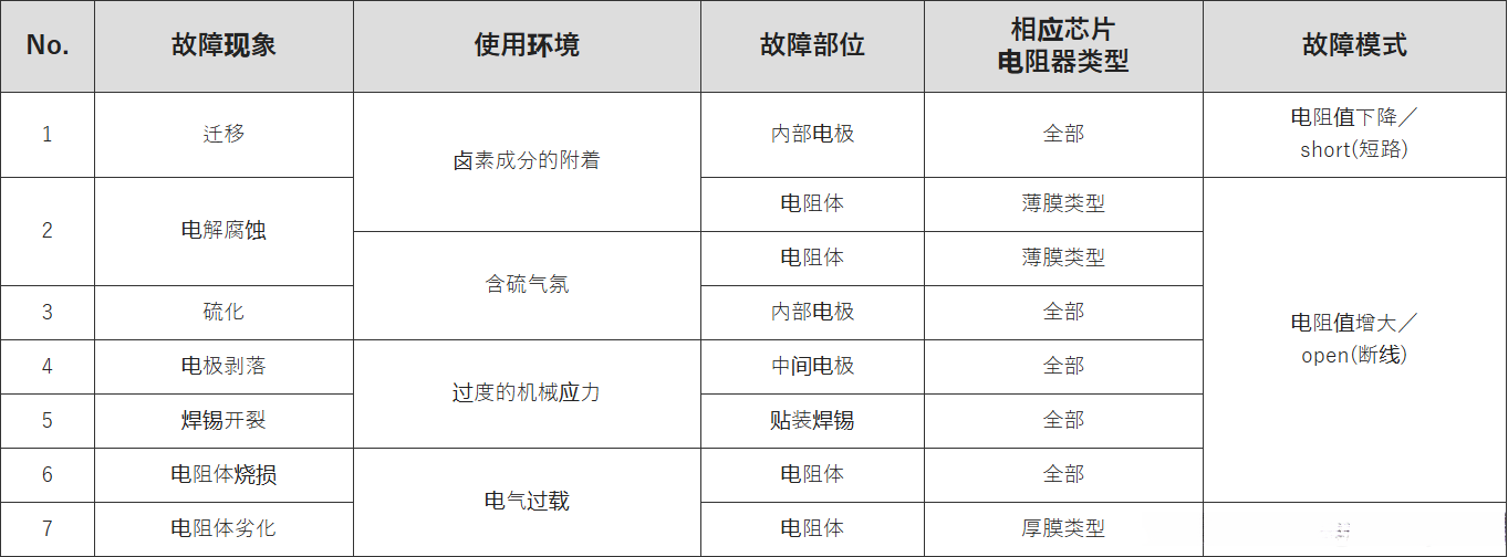 表1.贴片电阻器的故障要因小结