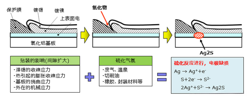 在含有硫气氛的情况下暴露芯片电阻器会导致其内部电极劣化的现象称为硫酸作用(简称"SO₂作用")。此外,在使用银基材料制造的芯片电阻器中会不可避免地发生此类硫酸作用进而导致厚膜与薄膜类型的故障出现。当芯片电阻器长时间处于含有二氧化硫的环境中时 硫酸分子会从其保护膜与镀层之间的微小间隙缓慢渗入其中。当这些二氧化硫分子到达接触表面的银质电极(Ag)时 由于Ag与S之间发生的化学反应生成了致密的Ag₂S晶体 而这种物质不仅阻碍了金属表面的形成还进一步腐蚀了原有的金属结构 导致其整体阻值急剧上升直至最终出现断线现象