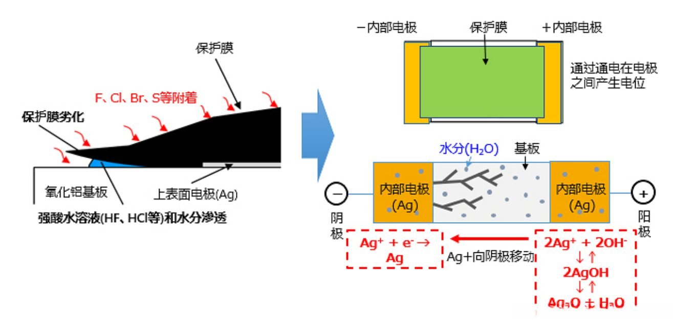 Ag电极由于被其保护膜或镀层完全覆盖,在一般使用环境下不会引发Ag迁移现象。然而当助焊剂中含有卤素物质(包括F、Cl、Br)并在保持活性力的状态下附着时,则会导致保护膜发生剥离现象并产生水分,在该区域存在电位时可能导致Ag迁移。