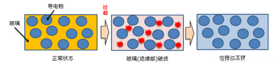 该类现象指的是由于过载产生的热量而导致电阻体性能下降的情形。此现象发生在由导电颗粒与玻璃组成的厚膜电阻器中,在对厚膜电阻器短暂施加超负荷电流(包括过电流、ESD和浪涌)时,并不会导致其熔融,在此情况下(即电路处于高阻值状态),构成电阻体的玻璃(绝缘部分)其绝缘性能有所下降。