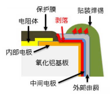 电极剥落是指芯片电阻器在其表面引线处承受强烈应力载荷作用而发生内部引线与中间引线剥落的现象。这种故障主要由回流焊接工艺中焊料收缩率异常、印刷电路板在热浸镀过程中发生挠曲以及模塑树脂固化收缩所造成:中间层引线受到过大的形变压力而发生分离现象;当所使用的焊料使用量高于常规规定时,并且在高于推荐回流焊接工艺温度曲线下的回流焊接过程中进行,则容易出现此故障;此外,在采用高温焊料的情况下(如某些不易因热缩开裂的特殊材料),也可能引发此问题;对于模塑基体产品而言,在制作过程中不仅单个引脚容易出现开裂现象;而且整个成品也会出现端面断裂的情况。