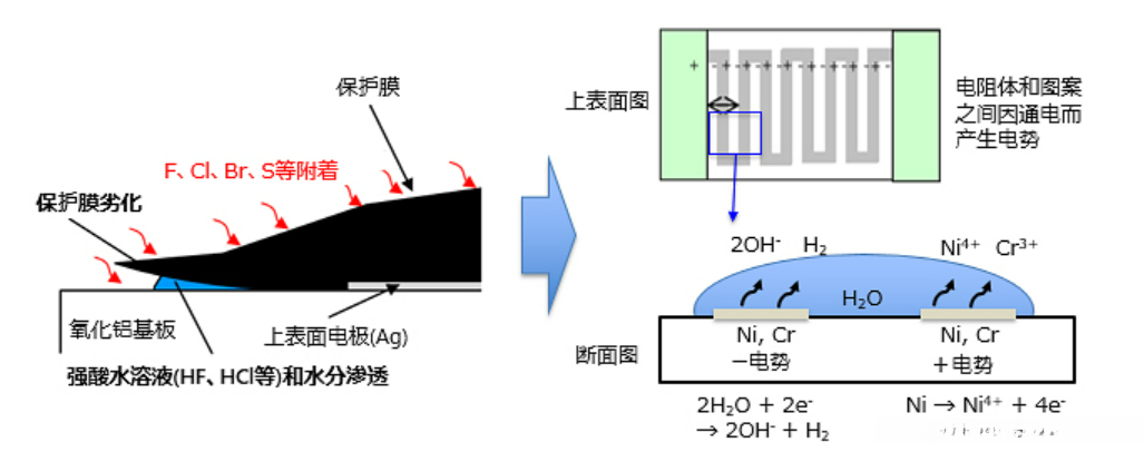 电解腐蚀涉及两种类型的损害:一种源自卤素组分的作用(F、Cl、Br),另一种源自硫磺组分的影响(S)。根据迁移机制所述,在助焊剂、胶粘剂及洗涤剂中含有这些卤素物质会附着在芯片电阻器表面,并且当处于含有硫的环境中则会导致其表面保护层受损;此外在这样的环境中容易进入并侵入内部电阻体内的水分与卤素也会渗入其中。对于薄膜 chip resistor 材质而言在其电阻体上使用了 Ni-Cr 合金材质因此在这些进入并侵入内部的情况下的腐蚀作用下会导致阻值升高或断线故障(open)。