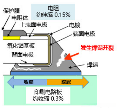 焊锡开裂主要由于客户使用的环境中的热冲击应力作用下才会出现这种故障现象。在实际应用过程中会发生频繁的温升和降温(温度交变),贴装在印刷电路板上的焊锡可能会因为芯片电阻器与印刷电路板之间存在不同的热膨胀/收缩率而导致产生的应力从而出现开裂现象;特别是在车载设备等具有较大温差的应用场景中更为需要注意。当焊锡出现开裂情况时其电阻值将会升高最终会导致电路断路。