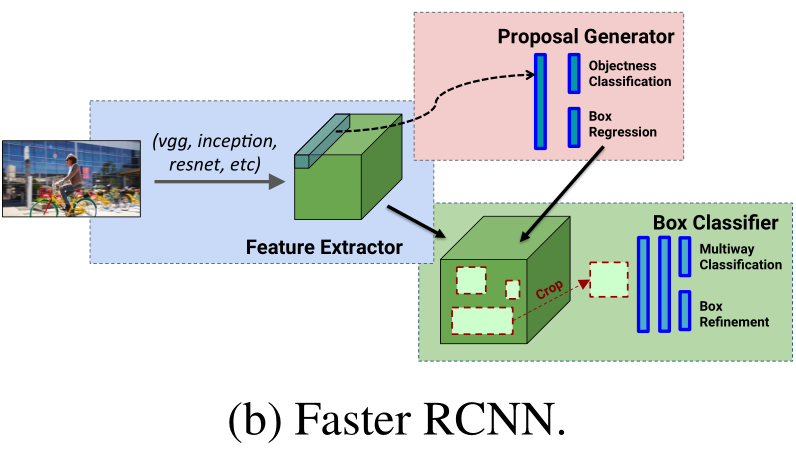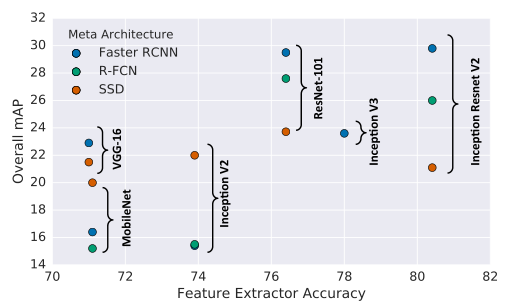 本文的重点将放在最近发展的三类meta-architecture上:SSD、Faster R-CNN以及R-FCN。尽管这些方法在各自的论文中均采用了特定类型的特征提取器,在本文研究中我们将分别从这些元结构中的特征提取器中分离出来。这样就能使它们能够采用任意形式的特征提取器。