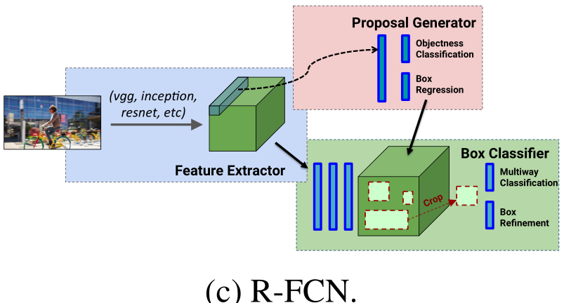 R-FCN的主要区别在于其生成区域提议层之前对特征进行裁剪而不是与生成区域提议层同一层。这种方法通过实现计算量的最小化来提高效率。