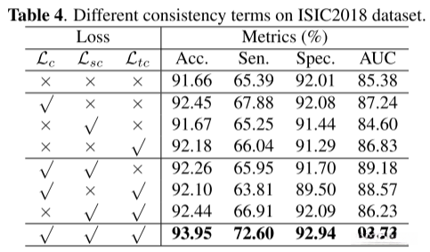 不同一致性项的消融研究如表4所示。当只使用监督损失项时,模型表现不佳。每个无监督损失项都可以显著提高最终性能,特别是对于AUC。此外,非监督损失条款的不同组合也能很好地发挥作用。例如,时间一致性和空间一致性损失都可以获得更高的AUC。当将所有无监督损失项组合在一起时,该模型在所有指标中进一步实现了最佳性能。