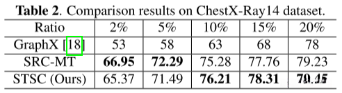 在表2中,GraphXNET是基线模型,它的性能与不同的标签数据百分比有很大的差异。随着标记数据百分比的改变,本文的方法表现出更稳定的性能。SRC-MT是之前的SOTA方法。此外,在标记数据设置为2%和5%时,STSC方法的AUC低于SRC-MT方法,在标记数据百分比增加时表现出更好的性能。这种现象可能是由于标记的数据受益于更可靠的关系结构。