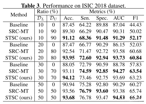 在表3中,研究了不同百分比标记数据的影响。本文的方法在10%、20%、30%和50%标记数据的情况下,可以获得优于基线和SOTA方法的性能。此外,STSC在只有20%标记数据的情况下可以获得更高的AUC和准确率,接近100%标记数据训练的上限。使用20%标记数据训练的模型与使用50%标记数据训练的监督基线模型的性能相当,这进一步验证了方法的有效性。