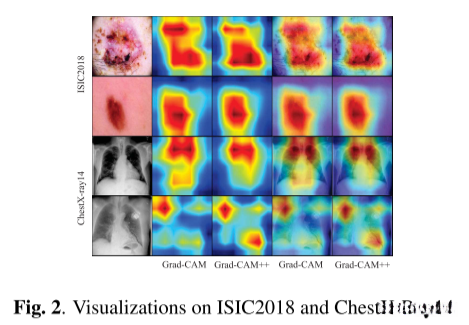 由Grad-CAM进行的可视化显示如图2所示,其中前两行是ISIC 2018数据集。我们的模型得到的注意区域与医生经验得到的病变区域是一致的,如前两排的注意地图几乎都与病变区域重叠。此外,在最后两行注意力图中,突出了症状明显的胸部区域。