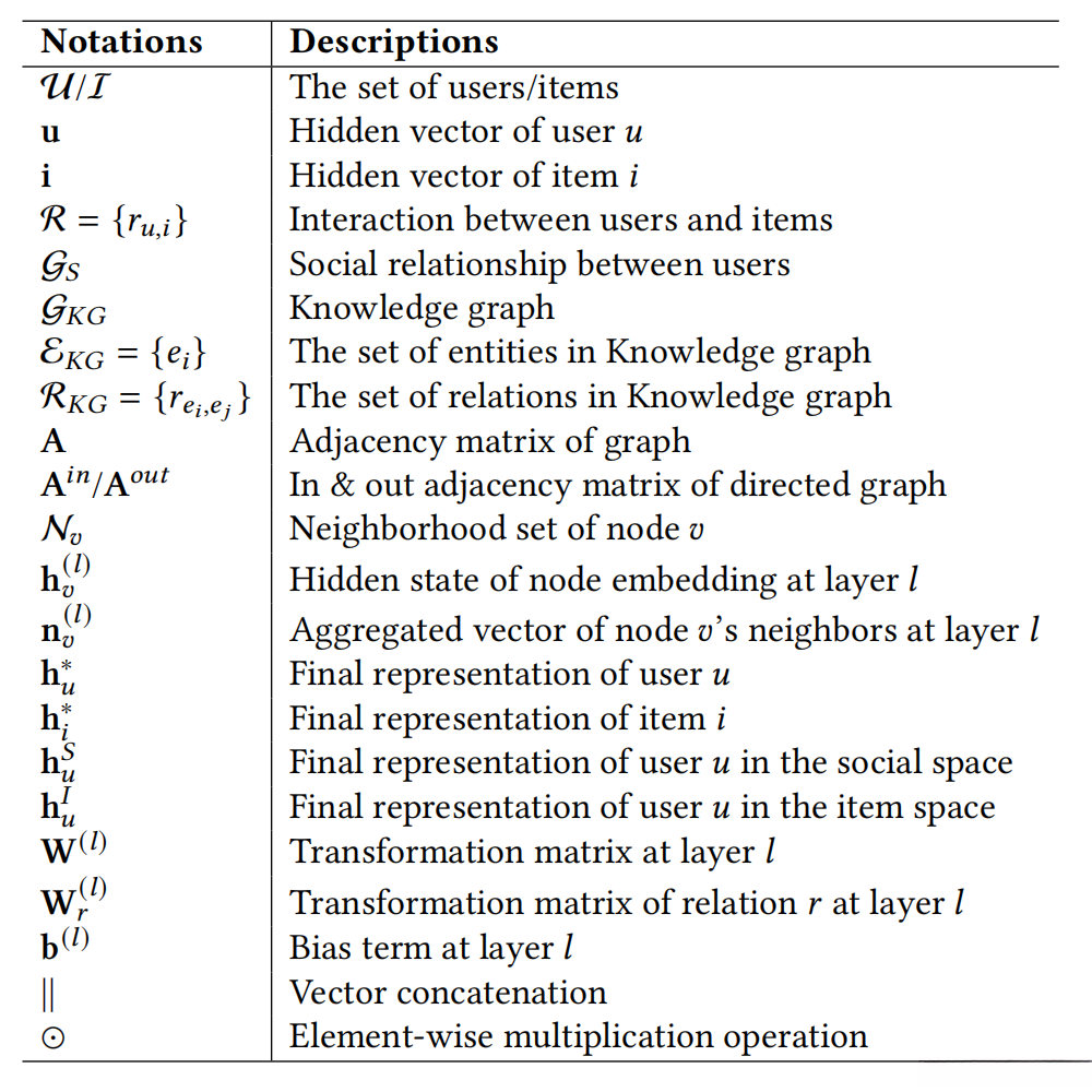推荐系统基于用户的兴趣特征与物品属性特征来识别或判断用户对物品的偏好程度。其中用户的兴趣特征与物品属性特征均以压缩向量的形式进行表示。因此,在该领域中基于包含历史交互记录以及其他辅助信息(如社交关系网络和知识图谱)的学习任务是主要的研究挑战