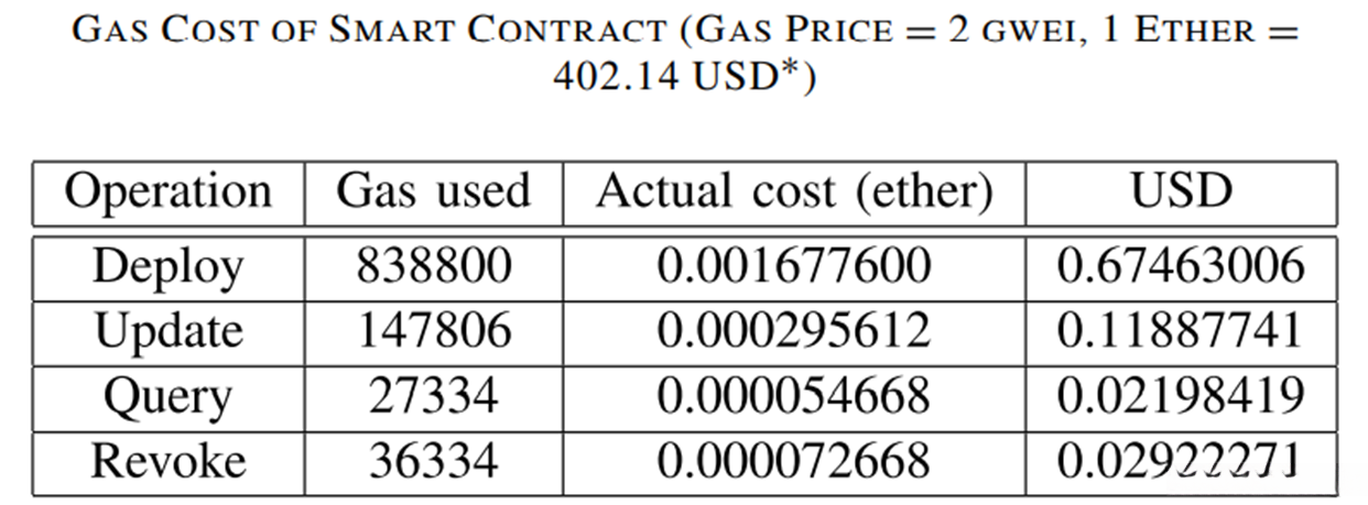 1.首先看一下在以太坊上实现的成本,仅在部署智能合约时开销较高,而且更新、查询、撤销的成本都较低,而物联网设备向服务器进行身份验证仅需一次查询公钥操作,也就是0.02美元,成本可以接受。