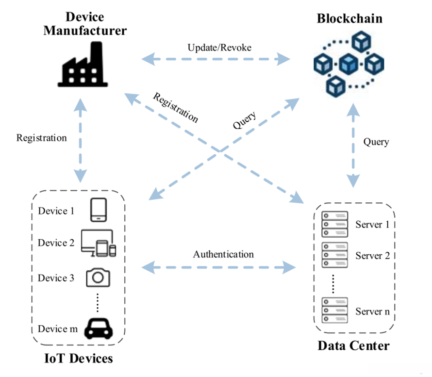 可以看到这个模型由 DM、物联⽹设备、数据中⼼的服务器和区块链组成。