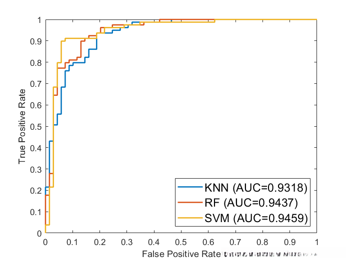 还有一种常用的评估手段:接受者工作特性曲线(Recevier operating characteristic, ROC)和曲线下面积(area under the curve,AUC)值,用来描述参数的整体表现能力。对于AUC值来讲,接近于1是理想值,当值小于0.5时,证明参数没有任何的分类能力。