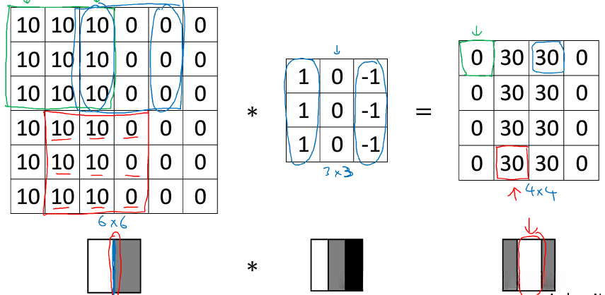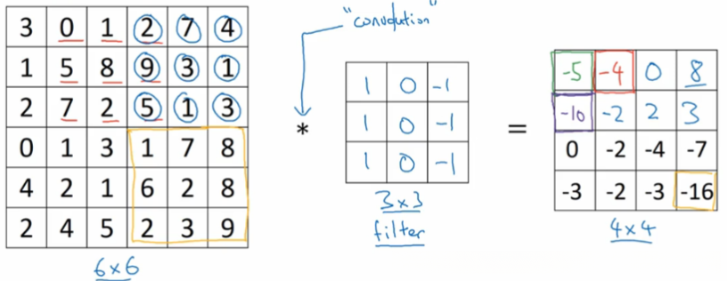以垂直边缘检测为例,原始图片尺寸为6x6,过滤器filter尺寸为3x3,卷积后的图片尺寸为4x4,得到结果如下:(注意这里的*表示卷积运算,跟乘法无关,python中,卷积用conv_forward()表示;tensorflow中,卷积用tf.nn.conv2d()表示;keras中,卷积用Conv2D()表示。)