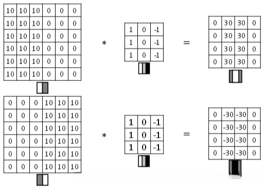 举一个简单的例子,下图最左是原图,可以看出中间有一个明显的竖线,经过卷积得到的图像中间就表示原图的边缘。这里看边缘有些粗,是因为我们的图像太小了,应用到正常图像会发现其检测的边缘相当不错。