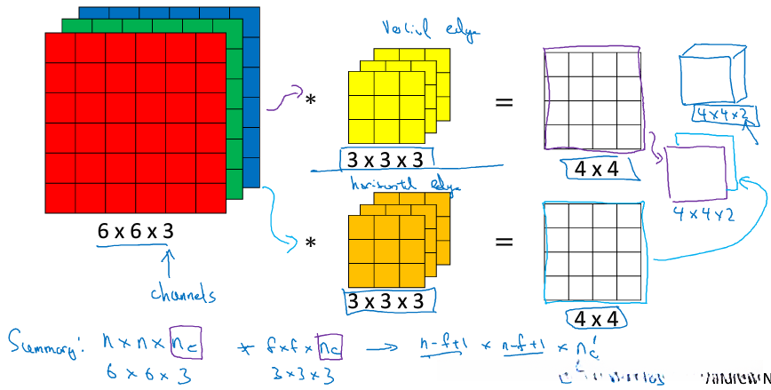 卷积计算过程和二维类似,即用过滤器覆盖原图,对应元素相乘最后相加,然后按步长在图像上移动过滤器,过滤器中不同通道其设计可以一样也可以不一样,例如想检测红色通道的竖线,就设计通道R检测垂直边缘,而G和B通道的过滤器都设置为0.
