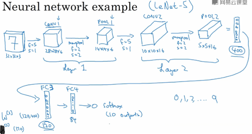图中,CON层后面紧接一个POOL层,共同构成第一层(因为POOL没有需要学习的参数),CONV2和POOL2构成第二层。