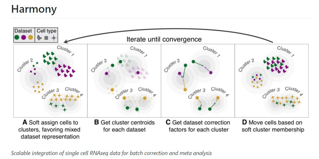 基本原理:我们用不同颜色代表不同的数据集,并用形状标记不同的细胞类型。首先采用Harmony方法通过主成分分析将转录组表达谱嵌入到低维空间中,并随后采用迭代过程来去除各数据集特有的影响因素。