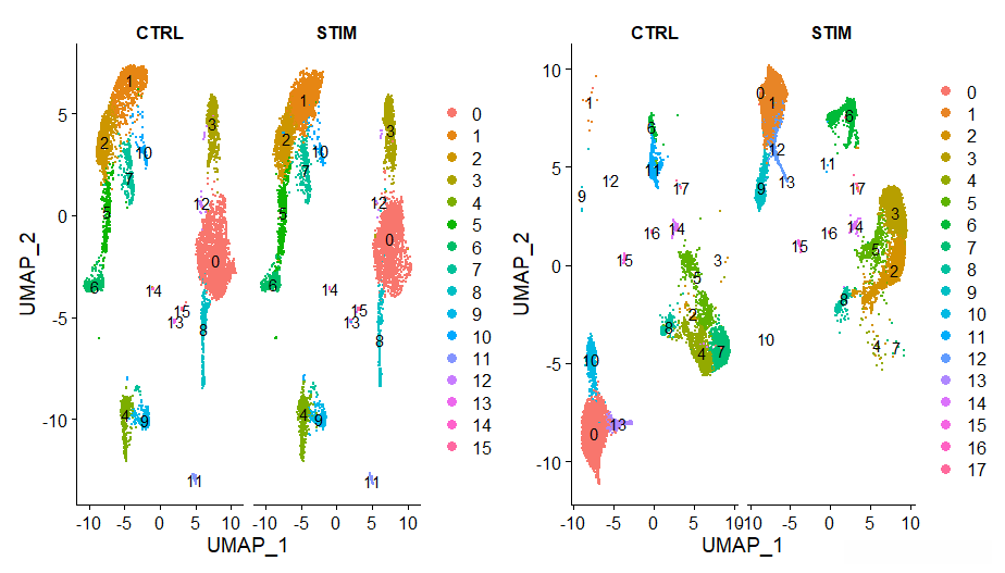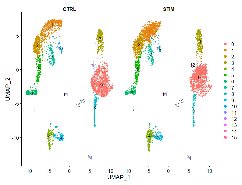 p1<- DimPlot(testAB.integrated,label = T,split.by = 'stim')#integrated