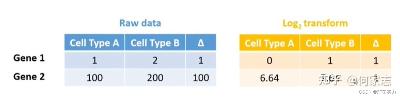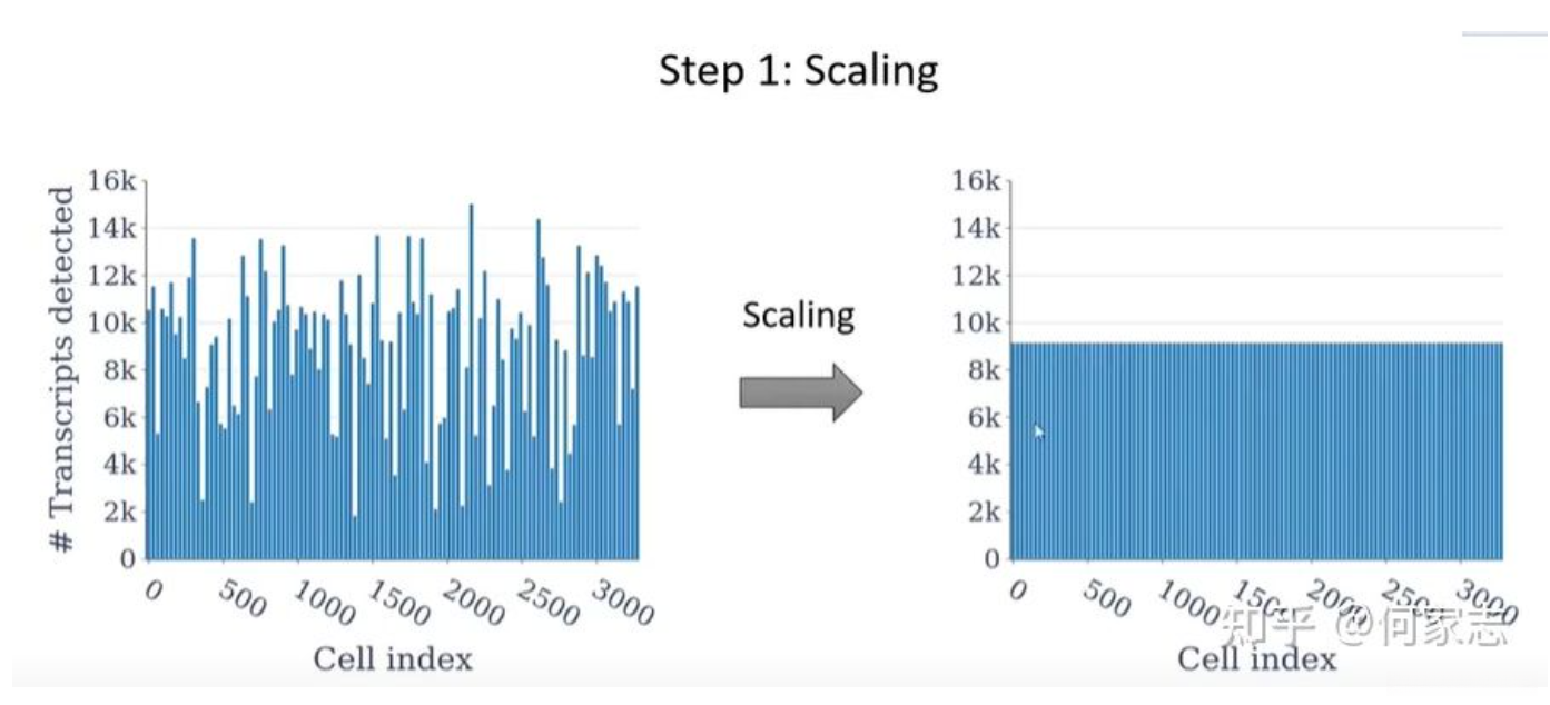 接着,在完成标准化转换后(它是执行主成分分析等降维操作之前的必要步骤)。标准化转换的目的是可见于下图所示的技术基础下的结果差异处理方法。基于技术特性,在各细胞检测到的转录水平存在差异的情况下(即数据存在噪声干扰),经过标准化转换后(使得各细胞间的转录水平具有可比性)。