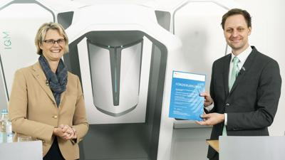 德国联邦教育和研究部部长 Anja Karliczek 将授予证书颁发给 IQM 首席执行官 Jan Goetz。(图片来源:BMBF/Hans-Joachim Rickel)