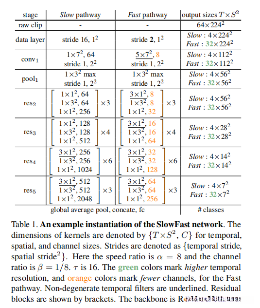 分别用C、S和T表示时间、空间和通道,并且它们具有相同的步长结构。这里速率比为α = 8(即每秒传输量),而通道比为β = 1:8(即快通道的传输速度是慢通道的8倍),τ被设定为16个时间单位。在快通道中使用绿色标注显示其具有更高的速率,并且橙色标注显示其拥有较少的传输通道数量。为了突出显示非退化的时间过滤器特性,在图形中标用了线条进行区分;而残差块则被方括号标注出来以明确其结构特征,在骨干网中采用的是ResNet-50模型作为基础网络架构
