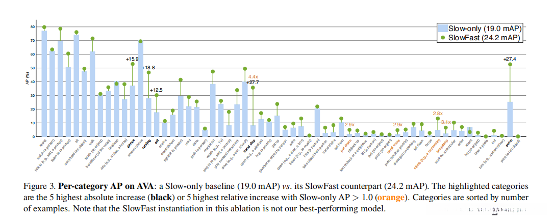 在图3中展示了AVA类别下的AP值分布情况。其中黑色突出显示的是前5个绝对增长最高的 Slow-Only 类别(Slow-Only),而橙色则标示了 Slow-Only 类别的排名前五(Top 5)。具体而言,在每个类别中都是按照数量进行排序展示的。值得注意的是,在消融实验中使用的 SlowFast 模型并非我们性能表现最佳的那个模型
