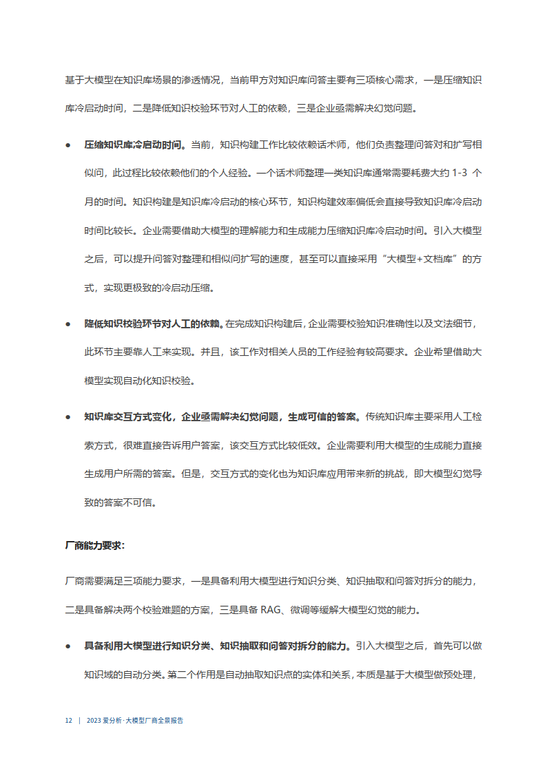- 具备 RAG、微调等缓解大模型幻觉的能力。企业需要利用大模型的生成能力直接生成用户所需 的答案。但是,交互方式的变化也为知识库应用带来新的挑战,即大模型幻觉导致的答案不可信。厂商需要具体幻觉大模型幻觉的能力,主要有 RAG、微调两种方式。RAG 是指在大语言模 型推理生成答案时,额外检索调用外部的知识,然后综合其检索结果进行回答生成。RAG 为大 模型提供了准确、丰富、可解释的知识支撑,从而实现更准确的语义理解、答案推理以及答案 解释。微调则是厂商根据行业或企业数据,对基础大模型进行优化,以便其更好地胜任特定任务。对基础大模型进行后训练也是一种缓解大模型幻觉的方式,但较高的成本导致其可行性较低。